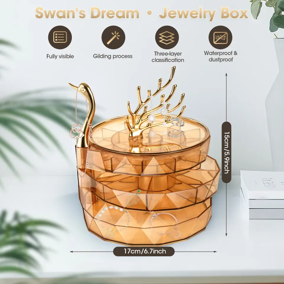 3 Layer Swan Jewelry Box, Luxury Swan Dream Desktop Jewelry Box, Large Capacity Earrings Earrings Jewelry Storage Box, Home Decor Tabletop Jewelry Organizer, Rotating Jewelry Transparent Display Stand